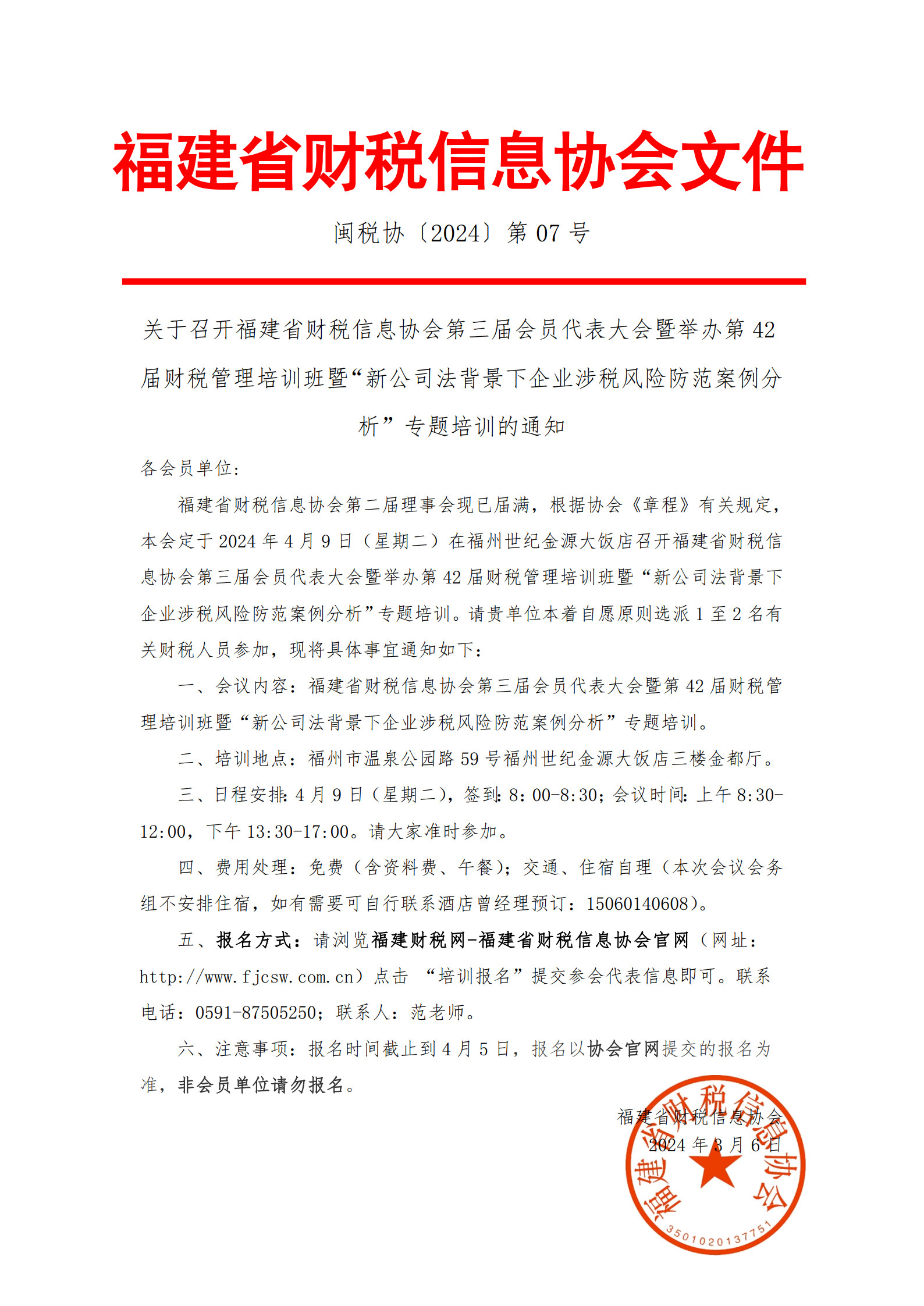 關(guān)于召開第三屆會員代表大會暨舉辦第42屆財稅管理培訓(xùn)班暨“新公司法背景下企業(yè)涉稅風(fēng)險防范案例分析”專題培訓(xùn)的通知