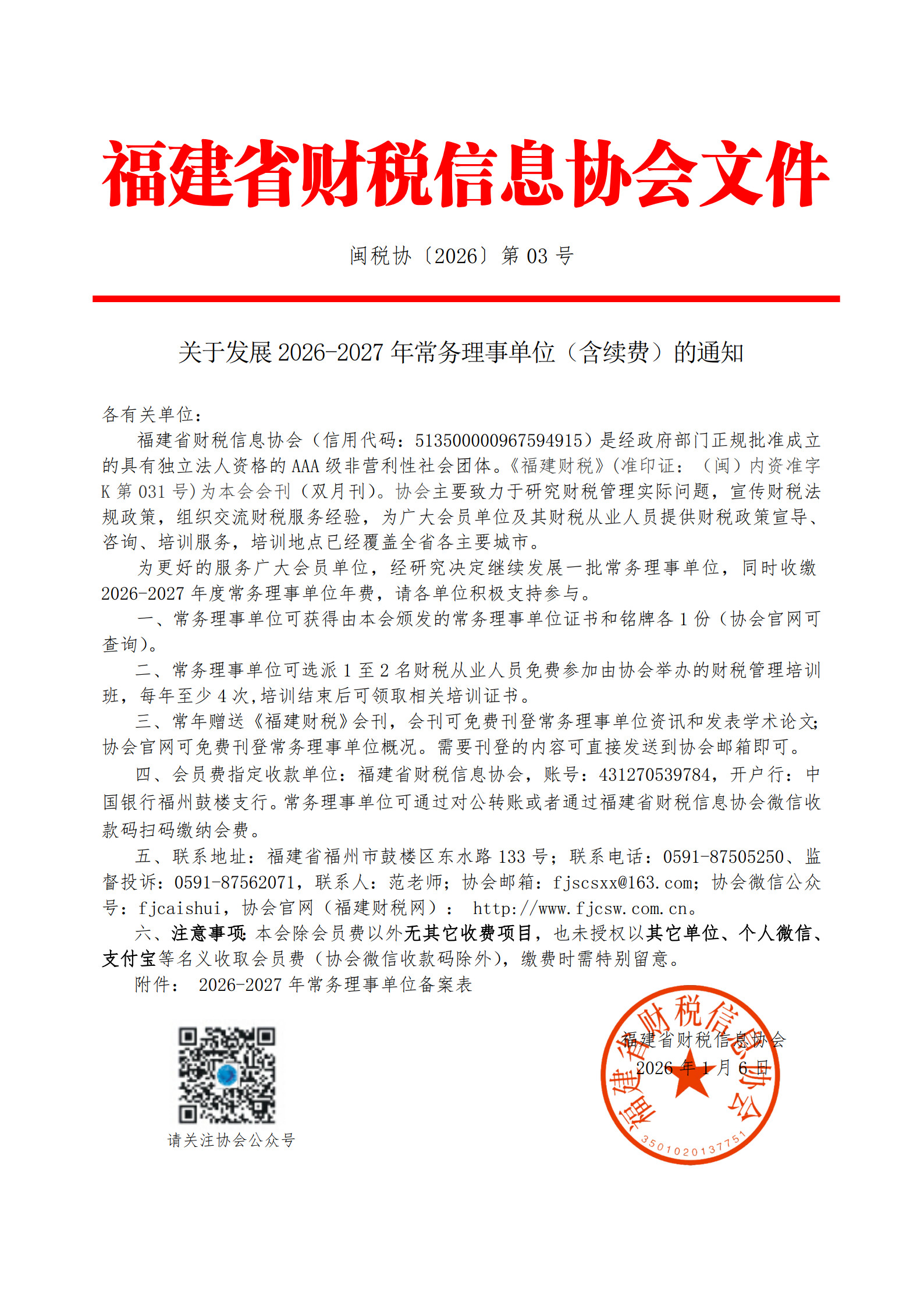 福建省財稅信息協(xié)會(信用代碼:513500000967594915)是經(jīng)政府部門正規(guī)批準成立的具有獨立法人資格的AAA級非營利性社會團體?!陡=ㄘ敹悺?準印證:(閩)內(nèi)資準字K第031號)為本會會刊(雙月刊)。協(xié)會主要致力于研究財稅管理實際問題,宣傳財稅法規(guī)政策,組織交流財稅服務(wù)經(jīng)驗,為廣大會員單位及其財稅從業(yè)人員提供財稅政策宣導、咨詢、培訓服務(wù), 為更好的服務(wù)廣大會員單位,經(jīng)研究決定繼續(xù)發(fā)展一批常務(wù)理事單位,同時收繳2026-2027年度常務(wù)理事單位年費,請各單位積極支持參與。