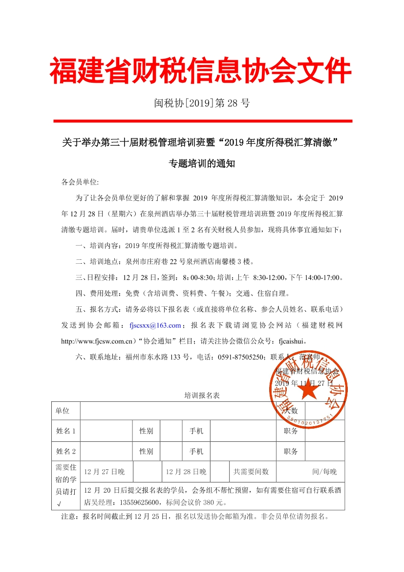 為了讓各會員單位更好的了解和掌握2019年度所得稅匯算清繳知識,本會定于2019年12月28日(星期六)在泉州酒店舉辦第三十屆財稅管理培訓(xùn)班暨2019年度所得稅匯算清繳專題培訓(xùn)。
