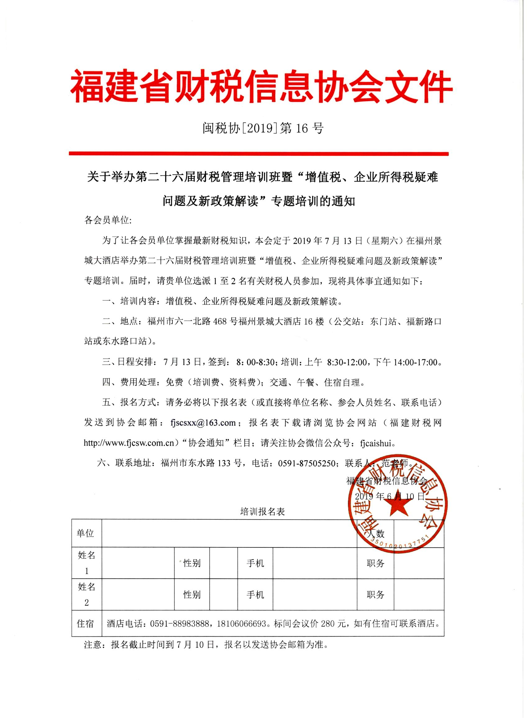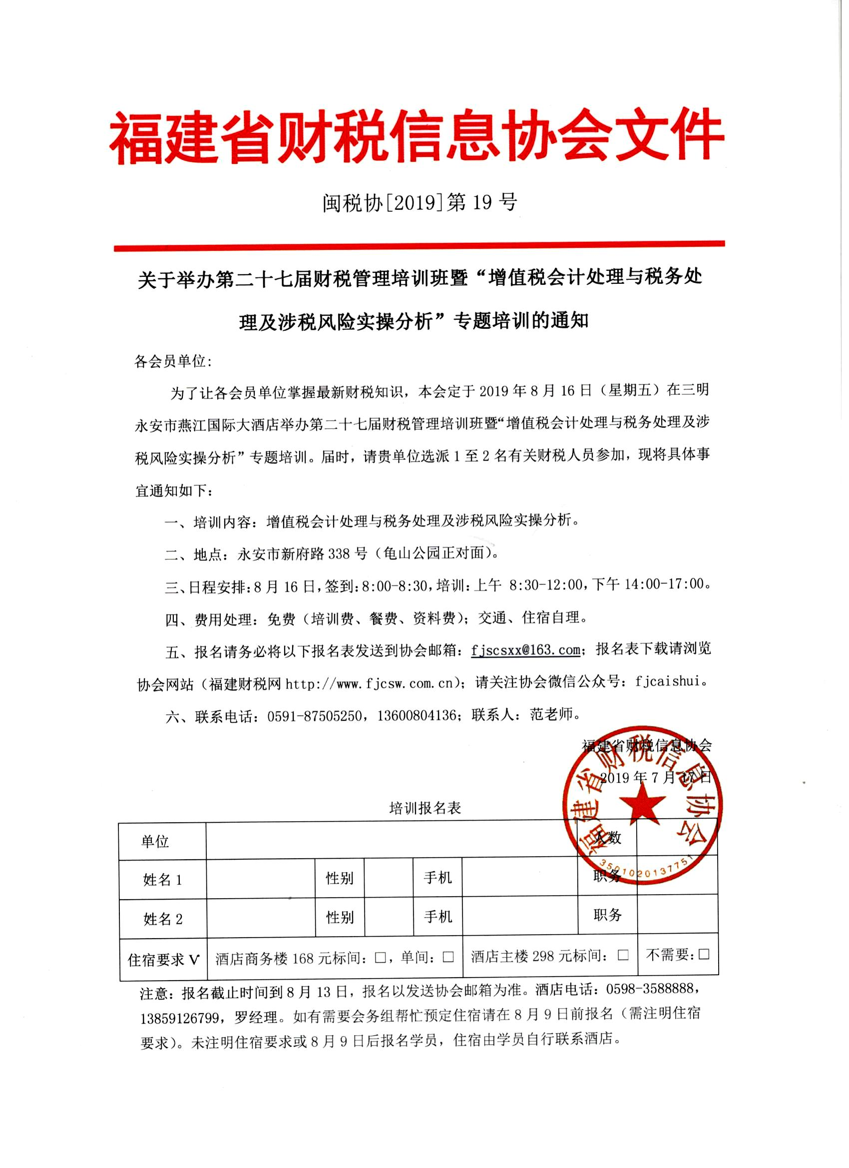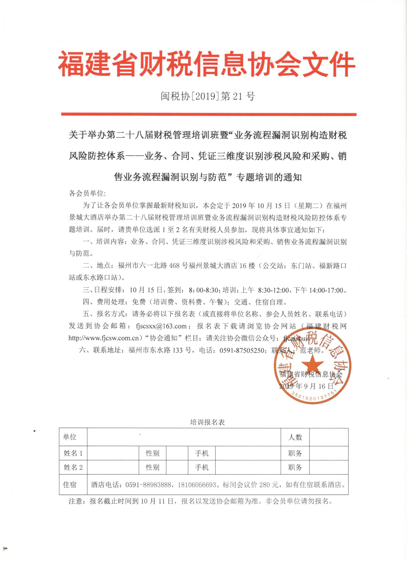 為了讓各會(huì)員單位掌握最新財(cái)稅知識(shí),本會(huì)定于2019年10月15日(星期二)在福州景城大酒店舉辦第二十八屆財(cái)稅管理培訓(xùn)班暨業(yè)務(wù)流程漏洞識(shí)別構(gòu)造財(cái)稅風(fēng)險(xiǎn)防控體系專題培訓(xùn)。