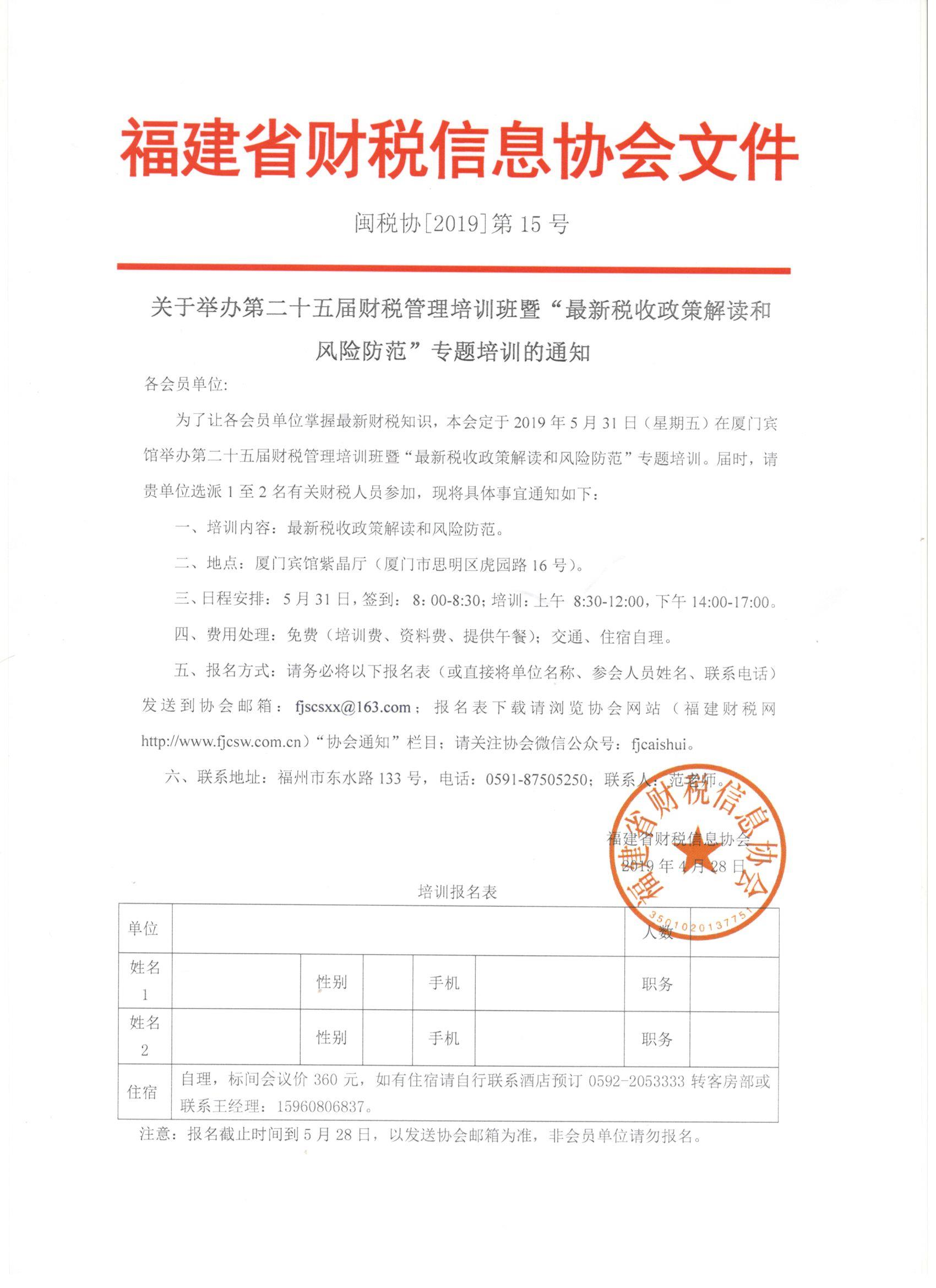 為了讓各會員單位掌握最新財稅知識,本會定于2019年5月31日(星期五)在廈門賓館舉辦第二十五屆財稅管理培訓(xùn)班暨“最新稅收政策解讀和風(fēng)險防范”專題培訓(xùn)。