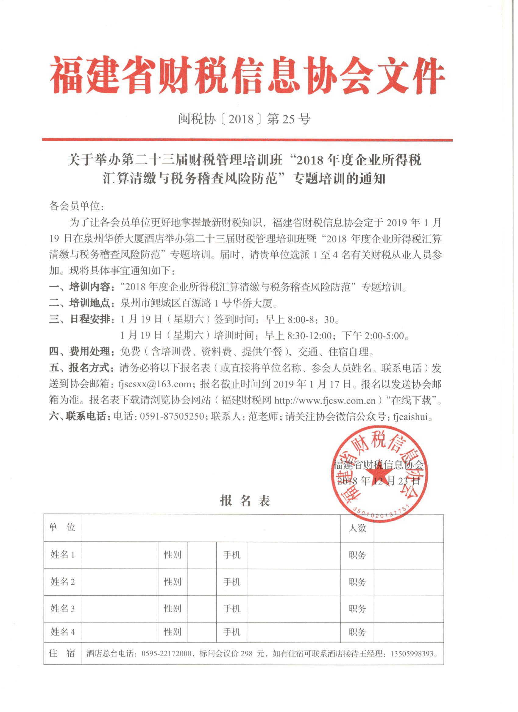 關(guān)于舉辦第二十三屆財(cái)稅管理培訓(xùn)班 “2018年度企業(yè)所得稅匯算清繳與稅務(wù)稽查風(fēng)險防范”專題培訓(xùn)的通知