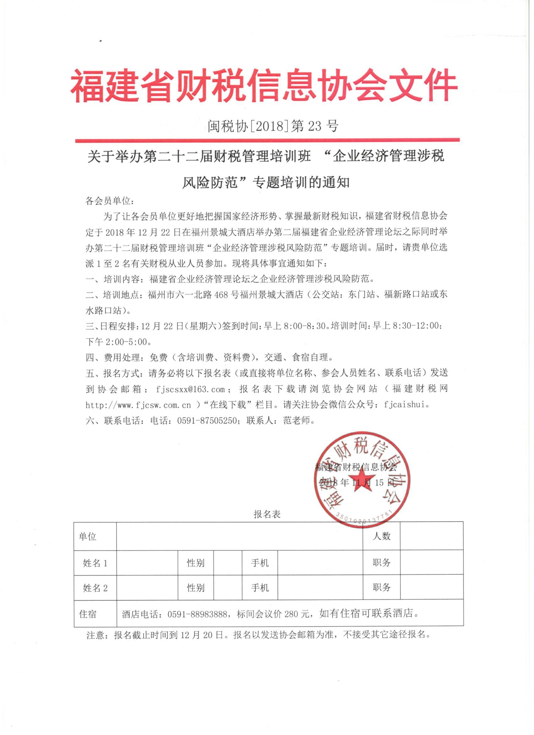 關(guān)于舉辦第二十二屆財(cái)稅管理培訓(xùn)班 “企業(yè)經(jīng)濟(jì)管理涉稅風(fēng)險防范”專題培訓(xùn)的通知
