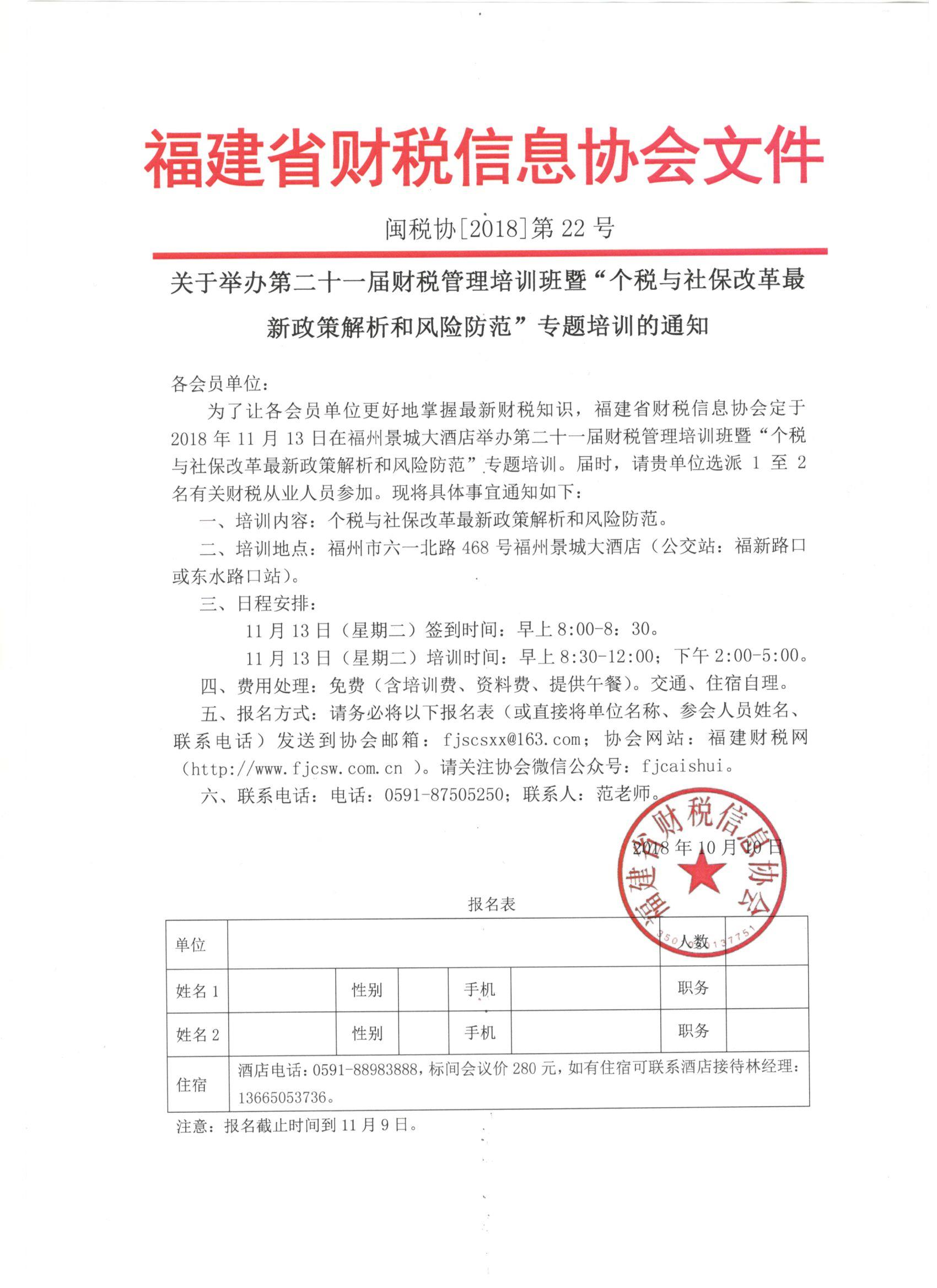 為了讓各會員單位更好地掌握最新財(cái)稅知識,福建省財(cái)稅信息協(xié)會定于2018年11月13日在福州景城大酒店舉辦第二十一屆財(cái)稅管理培訓(xùn)班暨“個稅與社保改革最新政策解析和風(fēng)險防范”專題培訓(xùn)。