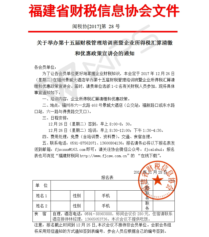 關(guān)于組織會員參加福建航天信息舉辦的匯算清繳“風(fēng)險(xiǎn)提示”排查與應(yīng)對方案專題培訓(xùn)(兩天精講班)的通知