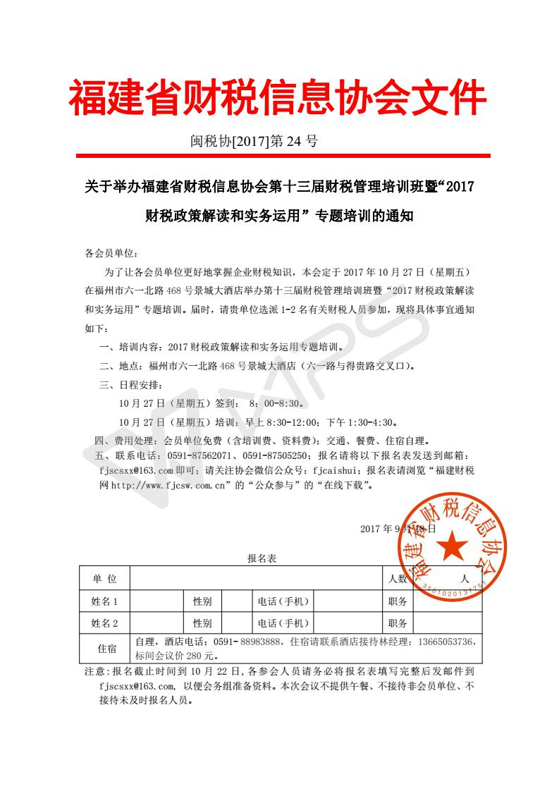 為了讓各會員單位更好地掌握企業(yè)財稅知識,本會定于2017年10月27日(星期五)在福州市六一北路468號景城大酒店舉辦第十三屆財稅管理培訓班暨“2017財稅政策解讀和實務運用”專題培訓。
