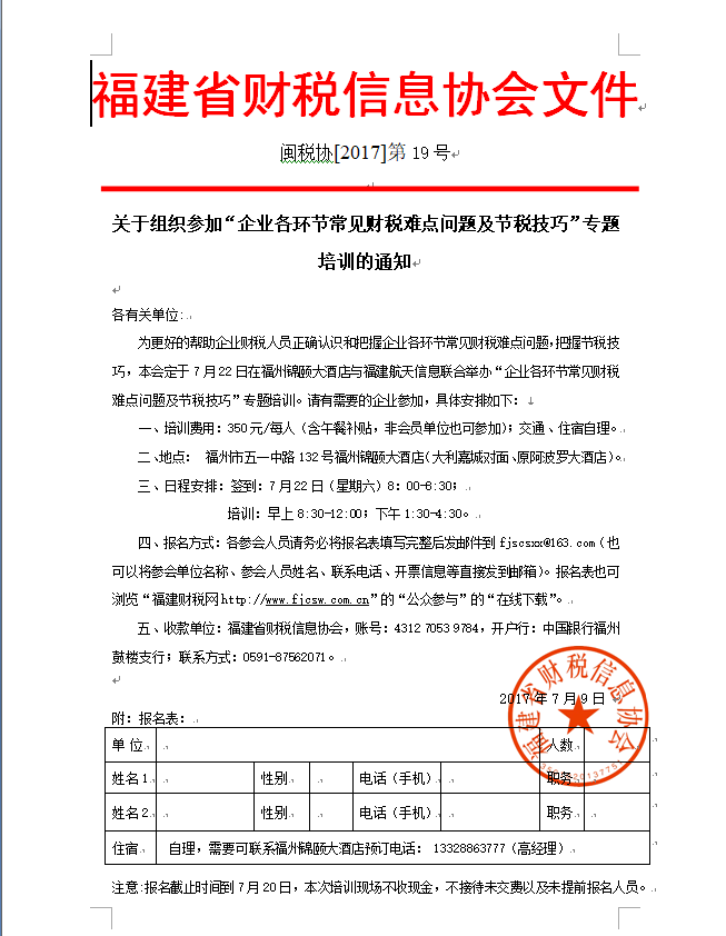 為更好的幫助企業(yè)財稅人員正確認識和把握企業(yè)各環(huán)節(jié)常見財稅難點問題,把握節(jié)稅技巧,本會定于7月22日在福州錦頤大酒店與福建航天信息聯(lián)合舉辦“企業(yè)各環(huán)節(jié)常見財稅難點問題及節(jié)稅技巧”專題培訓。