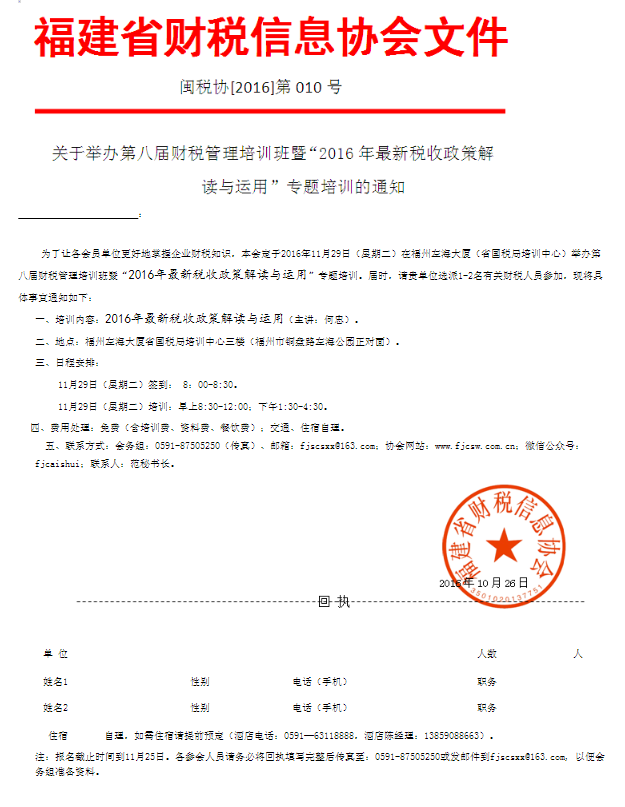 為了讓各會(huì)員單位更好地掌握企業(yè)財(cái)稅知識(shí),本會(huì)定于2016年11月29日(星期二)在福州左海大廈(省國(guó)稅局培訓(xùn)中心)舉辦第八屆財(cái)稅管理培訓(xùn)班暨“2016年最新稅收政策解讀與運(yùn)用”專題培訓(xùn)。