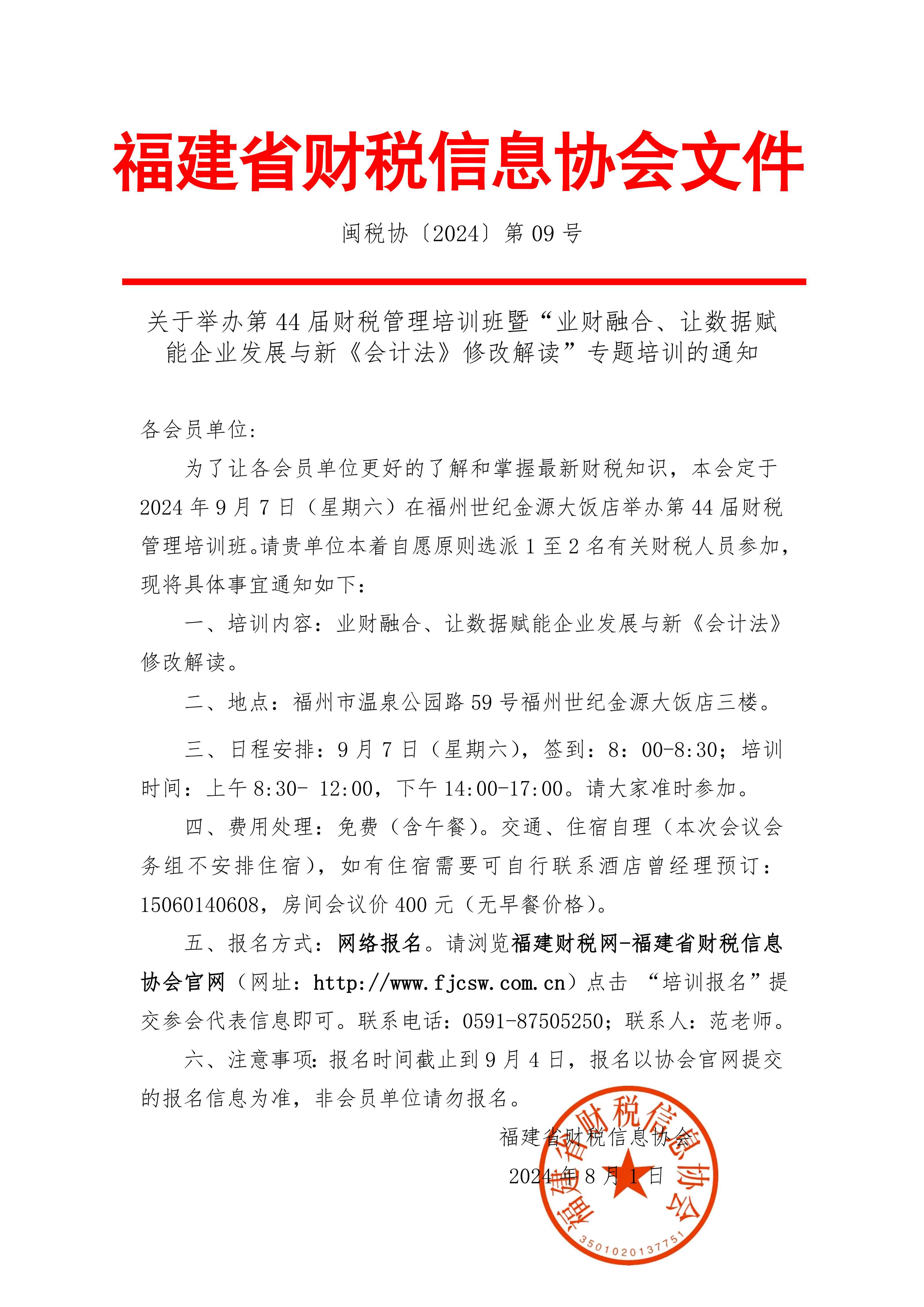為了讓各會員單位更好的了解和掌握最新財稅知識,本會定于2024年9月7日(星期六)在福州世紀(jì)金源大飯店舉辦第44屆財稅管理培訓(xùn)班,請貴單位本著自愿原則選派1至2名有關(guān)財稅人員參加。