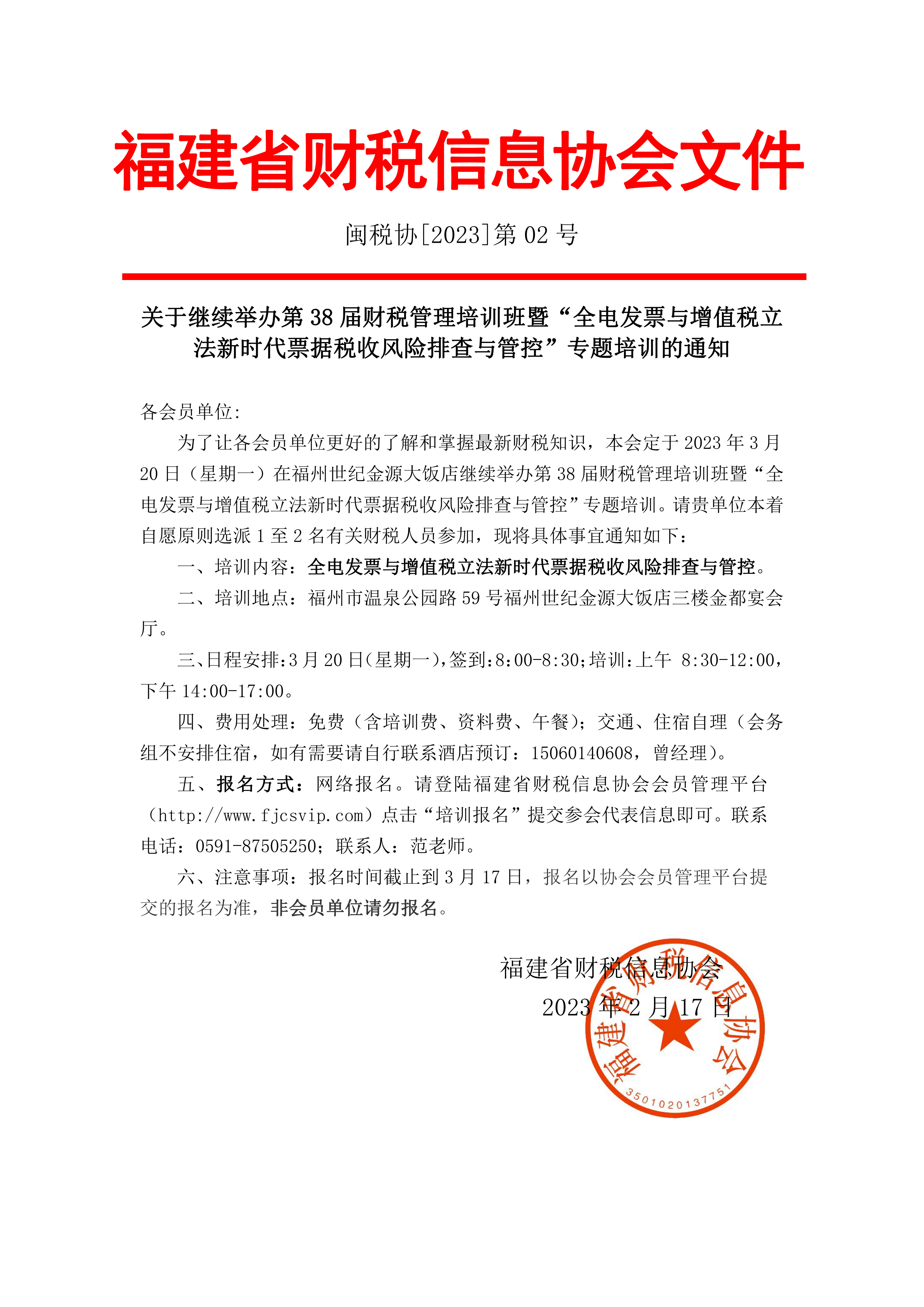 為了讓各會(huì)員單位更好的了解和掌握最新財(cái)稅知識(shí),本會(huì)定于2023年9月8日(星期五)在福州世紀(jì)金源大飯店舉辦第40屆財(cái)稅管理培訓(xùn)班暨“2023年稅收政策解讀及核心涉稅熱點(diǎn)問題風(fēng)險(xiǎn)化解技巧”專題培訓(xùn)。