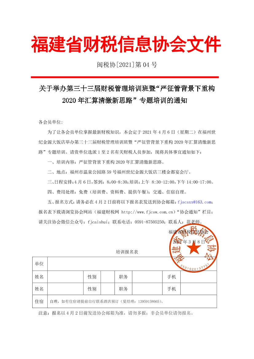 為了讓各會員單位掌握最新財稅知識,本會定于2021年4月6日(星期二)在福州世紀(jì)金源大飯店舉辦第三十三屆財稅管理培訓(xùn)班暨“嚴(yán)征管背景下重構(gòu)2020年匯算清繳新思路”專題培訓(xùn)。