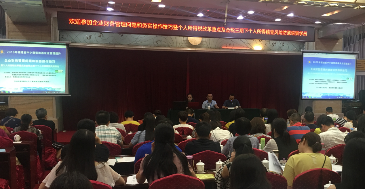 2018年8月24日,由福建省貿(mào)易促進(jìn)中心(福建省中小商貿(mào)流通企業(yè)公共服務(wù)平臺(tái))與福建省財(cái)稅信息協(xié)會(huì)主辦,福建航天信息科技有限公司莆田分公司、福建省企業(yè)經(jīng)濟(jì)評價(jià)協(xié)會(huì)聯(lián)合主辦的2018年福建省中小商貿(mào)流通企業(yè)管理提升項(xiàng)目之企業(yè)財(cái)務(wù)管理問題和實(shí)務(wù)操作技巧暨個(gè)人所得稅改革重點(diǎn)及個(gè)人所得稽查風(fēng)險(xiǎn)防范專題講座在莆田東方國際大酒店成功舉辦。