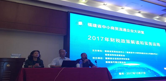 2017年10月27日,由福建省財(cái)稅信息協(xié)會(huì)與福建省貿(mào)易促進(jìn)中心(福建省中小商貿(mào)流通企業(yè)公共服務(wù)平臺(tái))共同主辦,福建省代理記賬協(xié)會(huì)等兄弟單位協(xié)辦的福建省中小商貿(mào)流通企業(yè)大講堂暨《2017年財(cái)稅政策解讀和實(shí)務(wù)運(yùn)用》專題講座(福建省財(cái)稅信息協(xié)會(huì)第十三屆財(cái)稅管理培訓(xùn)班)在福州景城大酒店成功舉辦。