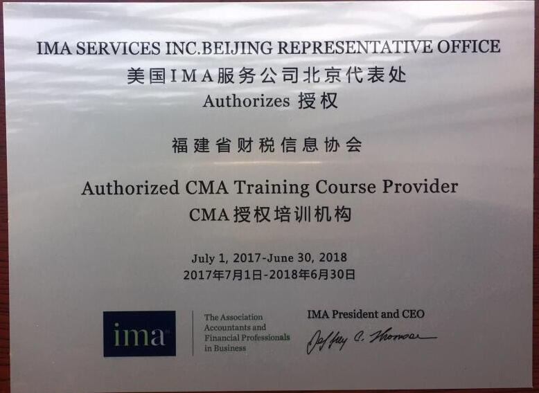 2017年7月1日,經(jīng)福建省財稅信息協(xié)會向美國IMA服務(wù)公司北京代表處申請,IMA美國注冊管理會計師協(xié)會嚴格審核通過,福建省財稅信息協(xié)會正式榮獲CMA注冊管理會計師授權(quán)培訓(xùn)機構(gòu),授權(quán)范圍為福建省。