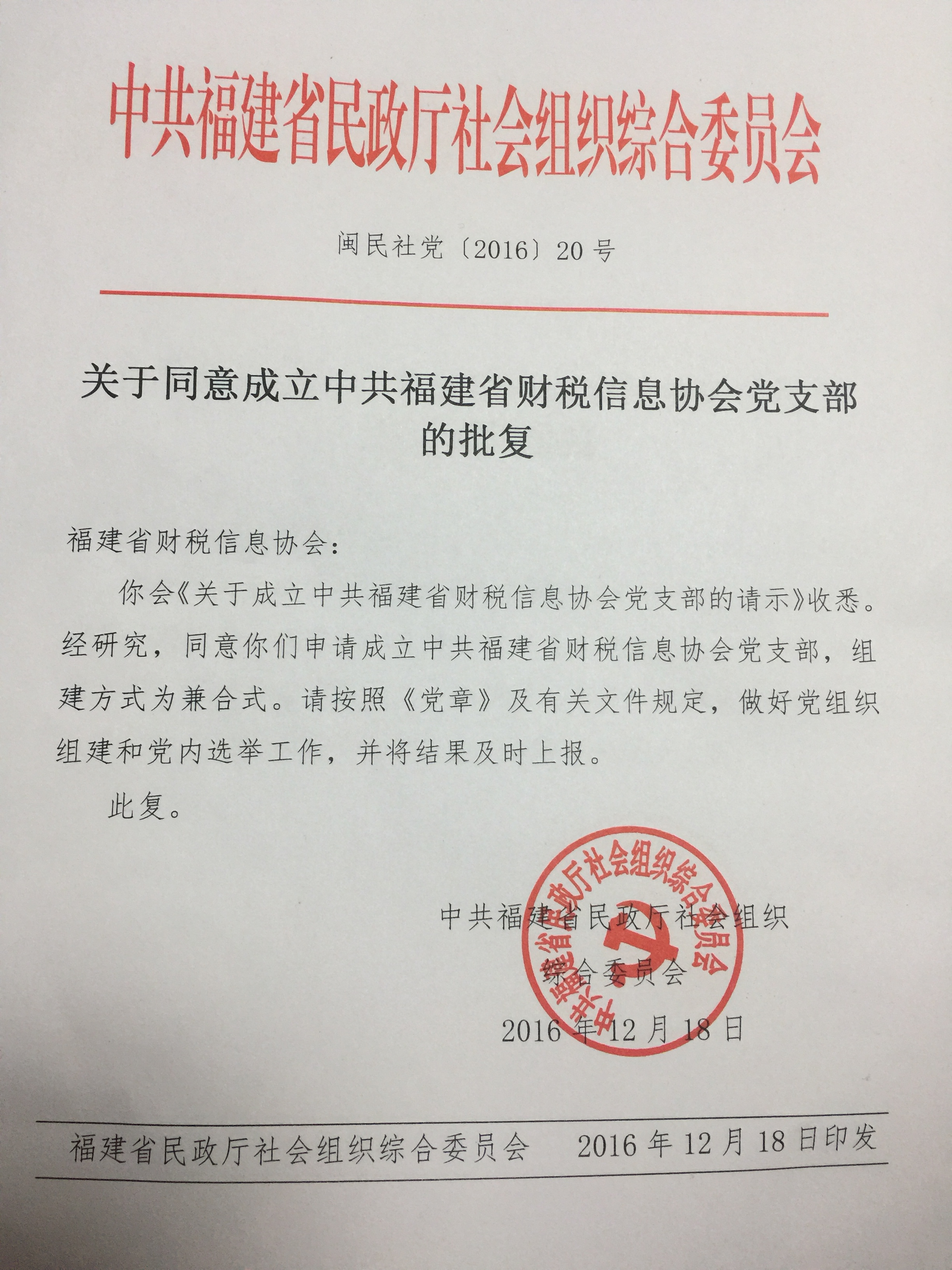 2016年12月18日,中共福建省民政廳社會組織綜合委員會《關于同意成立中共福建省財稅信息協(xié)會支部的批復》。